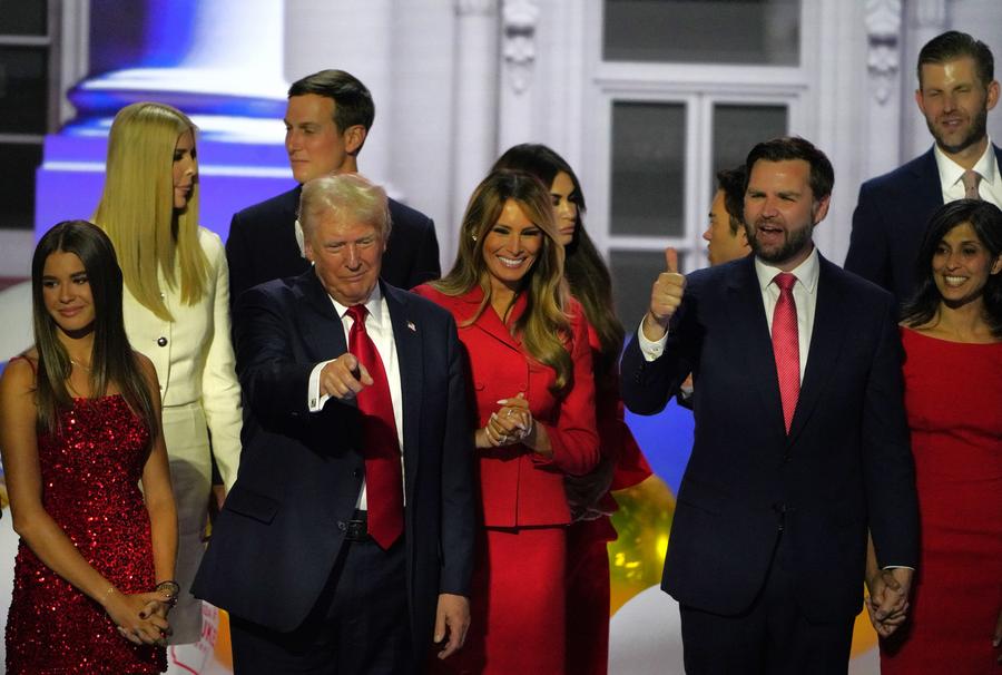 Former U.S. President Donald Trump (2nd L, front) and Republican vice presidential candidate J.D. Vance (R, front) gesture during the Republican National Convention in Milwaukee, Wisconsin, the United States, on July 18, 2024. (Xinhua/Wu Xiaoling)