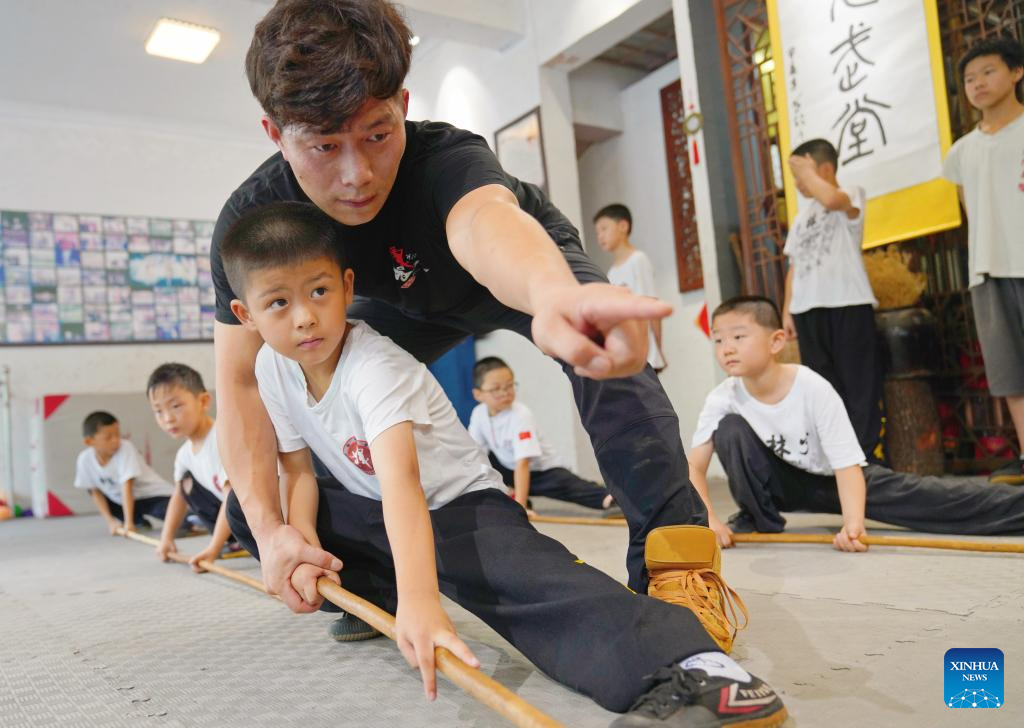 A martial arts teacher teaches students in Huagang Town, Feixi County in Hefei, east China's Anhui Province, July 19, 2024. (Photo by Ma Jiagui/Xinhua)