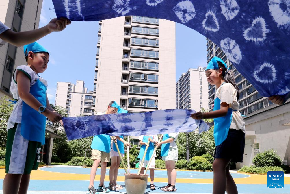 Children experience tie-dye in Deqing County of Huzhou, east China's Zhejiang Province, July 19, 2024. (Photo by Xie Shangguo/Xinhua)