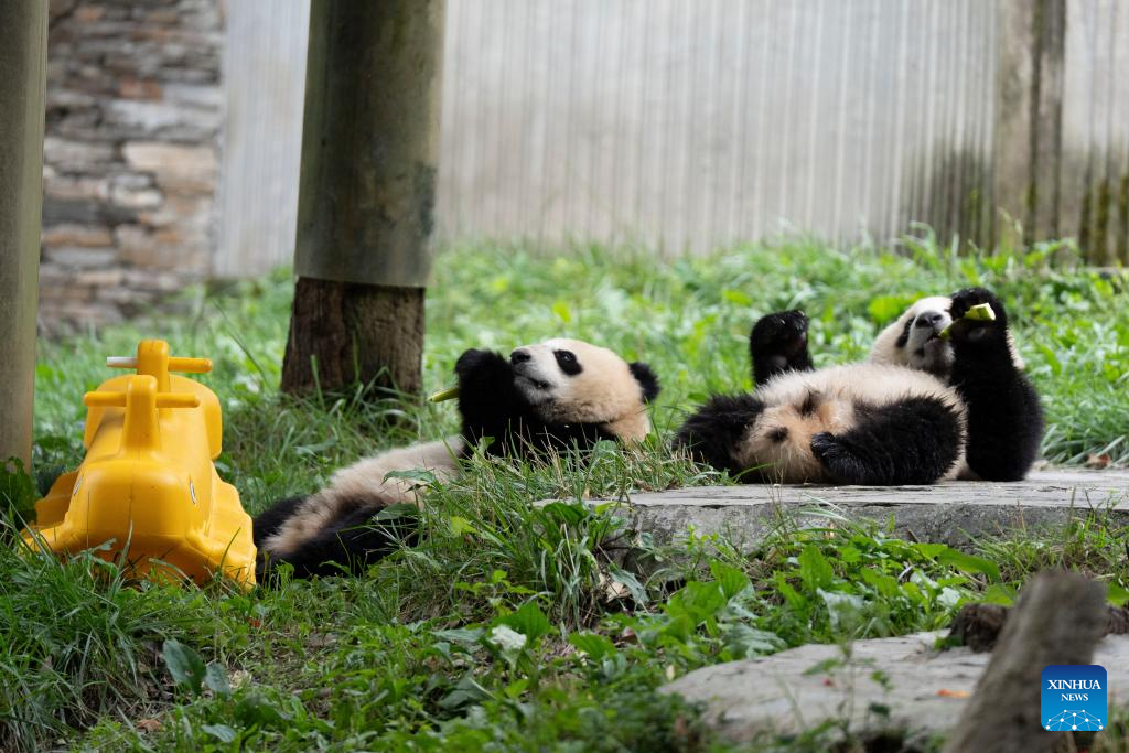 Giant panda cubs eat bamboos at the Shenshuping giant panda base of Wolong National Nature Reserve in southwest China's Sichuan Province, July 19, 2024. A special event was held to celebrate the birthdays of giant pandas here on Friday. Carrots, watermelons and other food were prepared for them as the birthday treat. (Xinhua/Xue Chen)