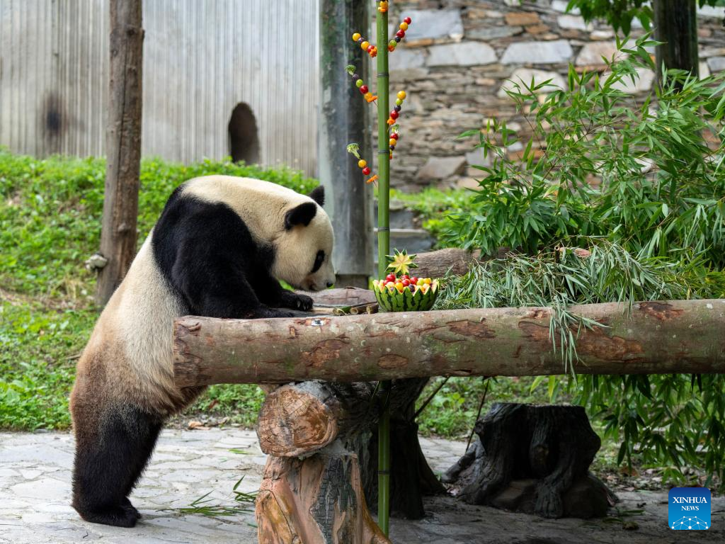 Giant panda Pan Yue enjoys a birthday treat at the Shenshuping giant panda base of Wolong National Nature Reserve in southwest China's Sichuan Province, July 19, 2024. A special event was held to celebrate the birthdays of giant pandas here on Friday. Carrots, watermelons and other food were prepared for them as the birthday treat. (Xinhua/Yu Li)