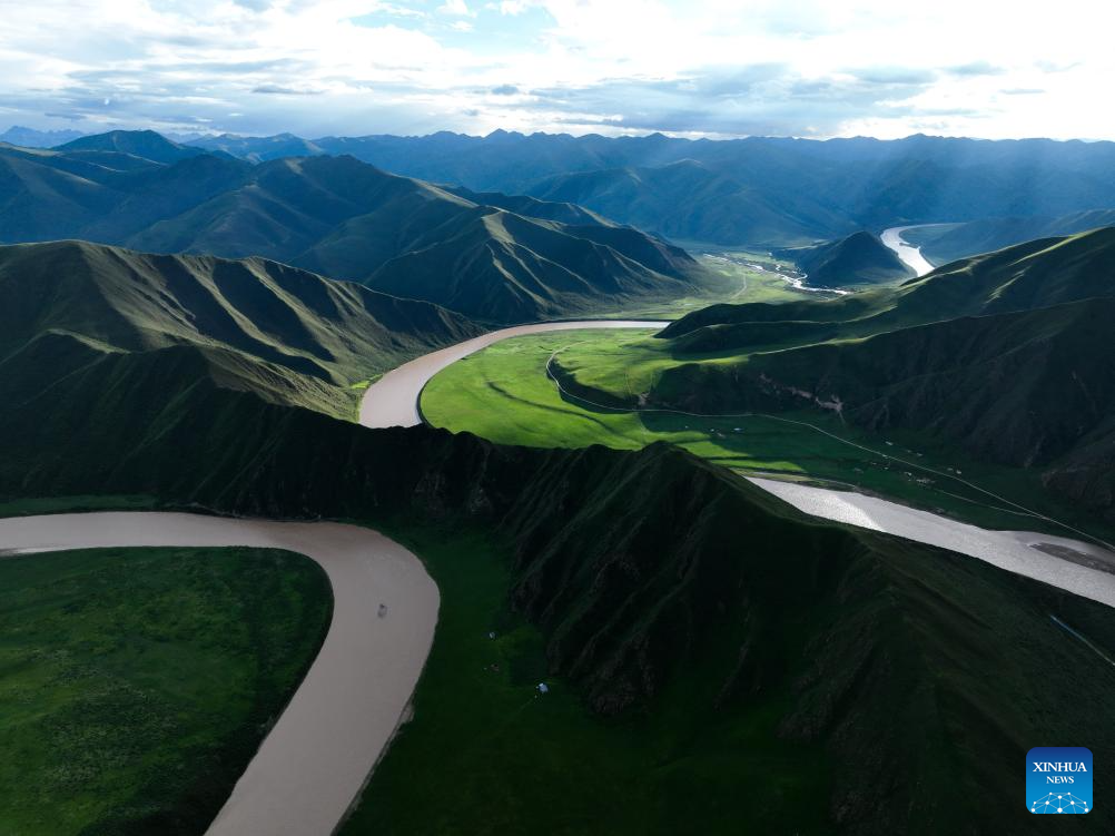An aerial drone photo taken on July 19, 2024 shows the scenery at a bend along the Yellow River in Mentang Township of Jiuzhi County, Golog Tibetan Autonomous Prefecture, northwest China's Qinghai Province. (Xinhua/Zhang Long)