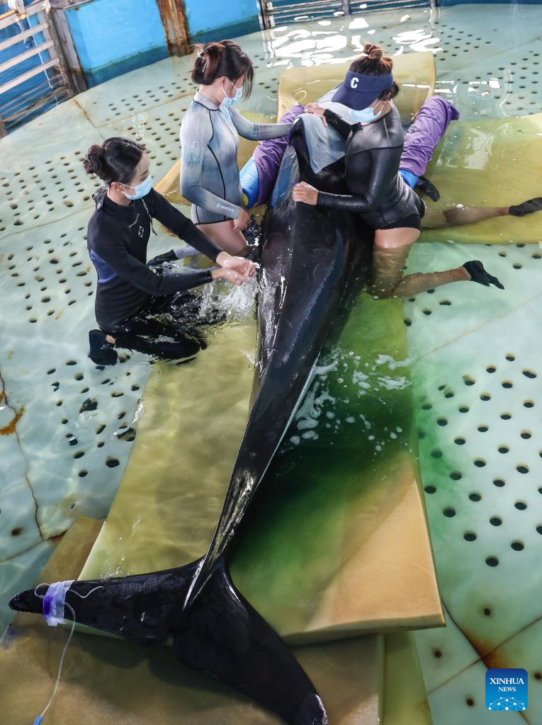 Volunteers help a short-finned pilot whale maintain balance at Sanya Haichang Animal Conservation Center in Sanya, south China's Hainan Province, July 20, 2024. (Xinhua/Zhang Liyun)?