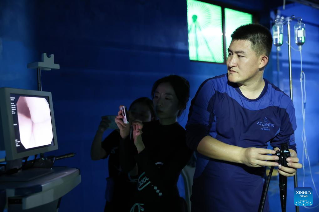 A veterinarian (1st R) perform a gastroscope inspection on a short-finned pilot whale at Sanya Haichang Animal Conservation Center in Sanya, south China's Hainan Province, July 20, 2024. (Xinhua/Zhang Liyun)
