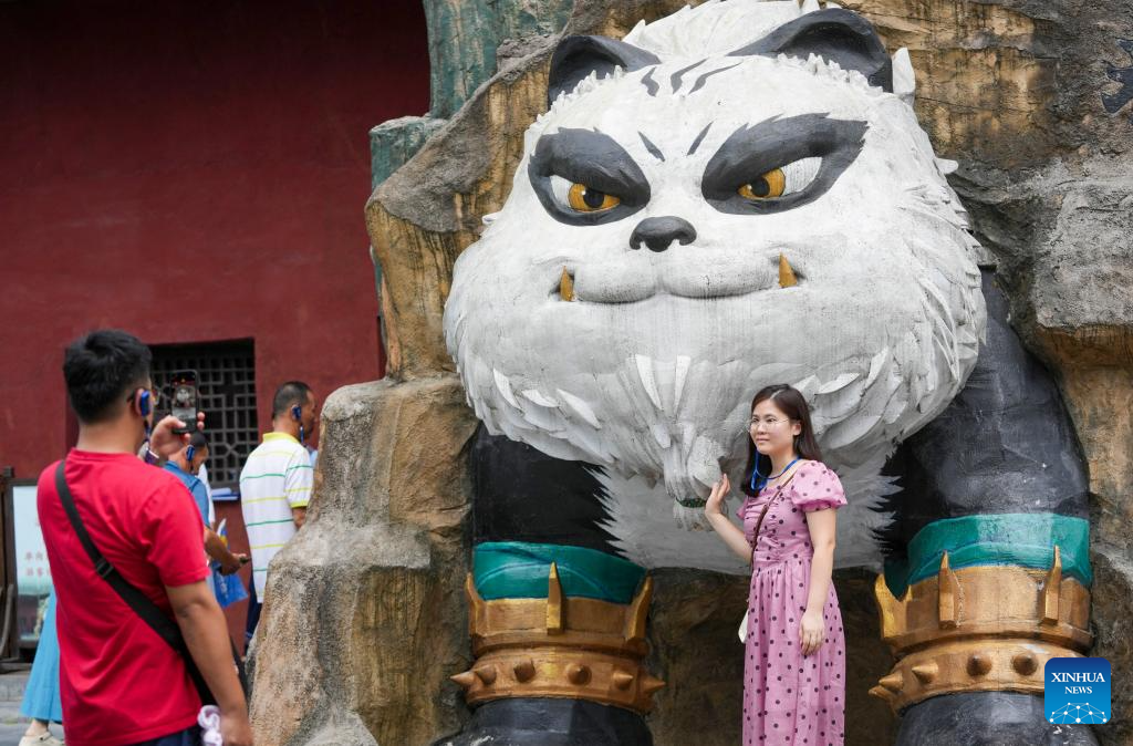 A tourist poses for photos at Chiyou Jiuli Town scenic spot of Pengshui Miao-Tujia Autonomous County, southwest China's Chongqing, July 20, 2024. Local authorities of Pengshui Miao-Tujia Autonomous County has taken advantages of ethnic features to promote its summer tourism. (Xinhua/Liu Chan)