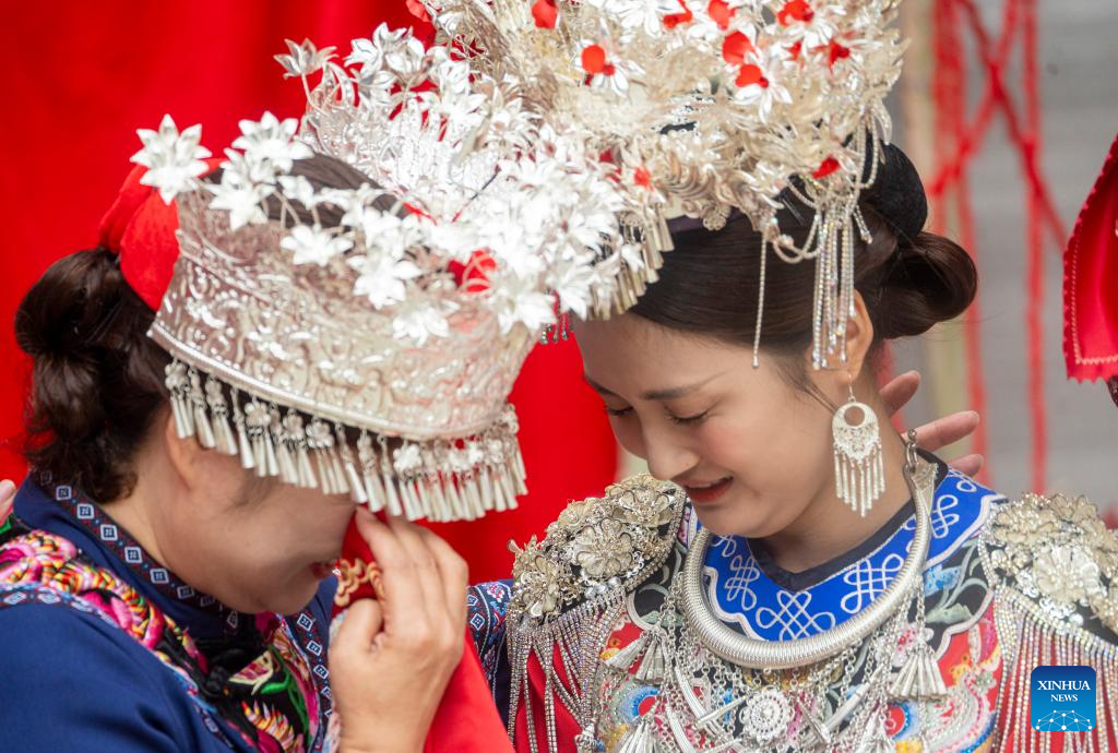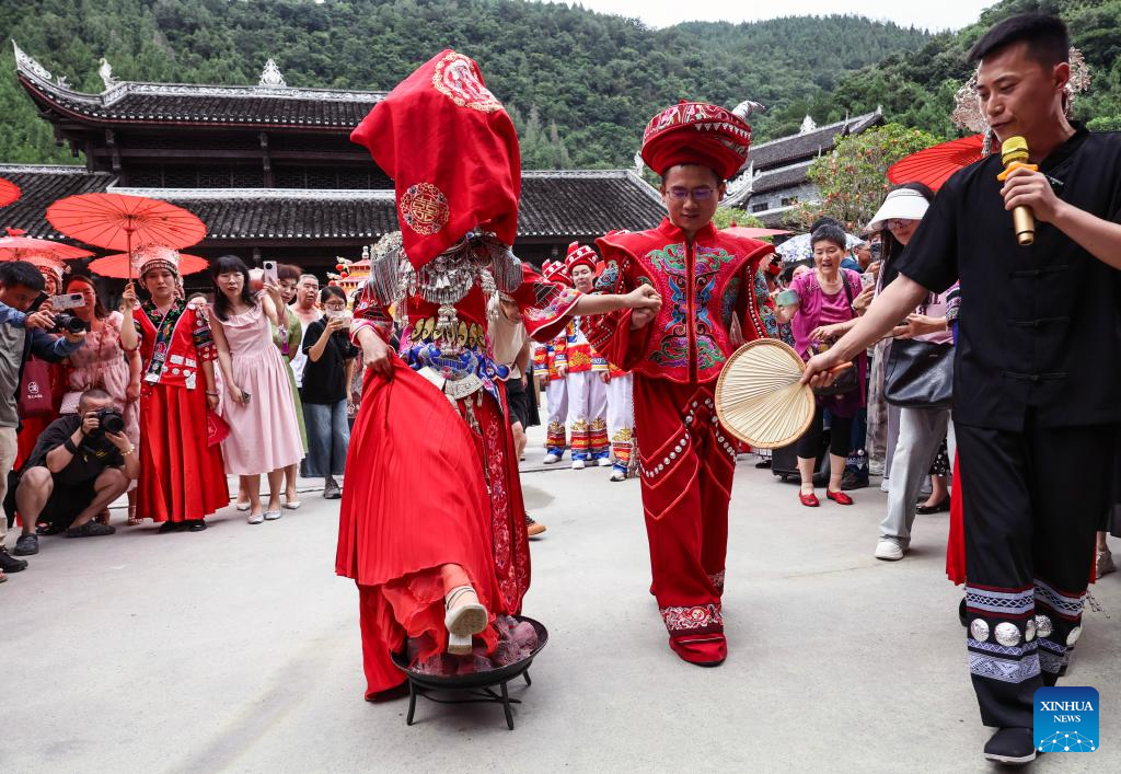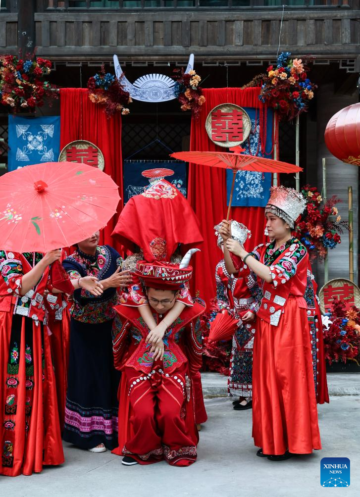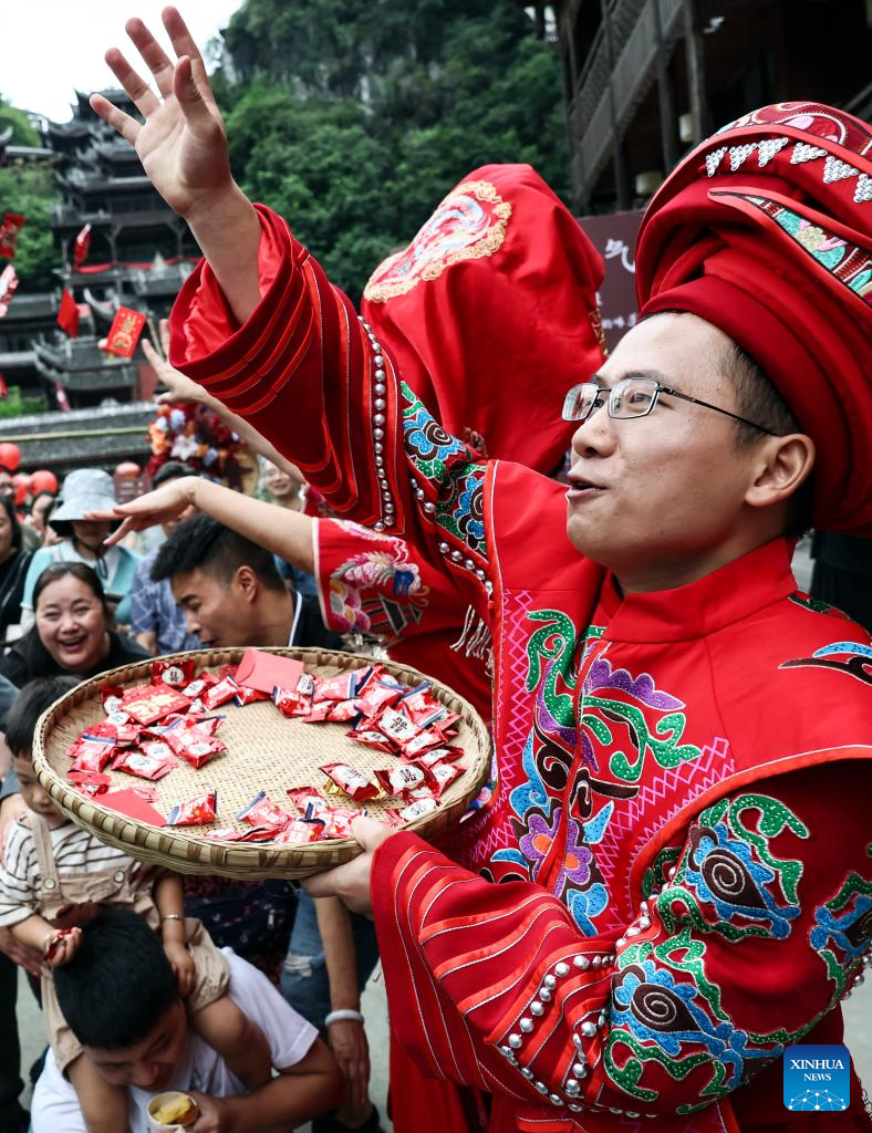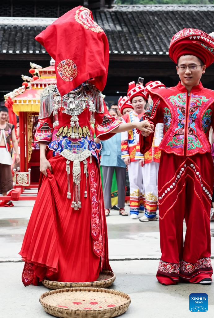 A wedding with Miao ethnic group features is pictured at Chiyou Jiuli Town scenic spot of Pengshui Miao-Tujia Autonomous County, southwest China's Chongqing, July 20, 2024. Local authorities of Pengshui Miao-Tujia Autonomous County has taken advantages of ethnic features to promote its summer tourism. (Photo by Li Xiaoguo/Xinhua)