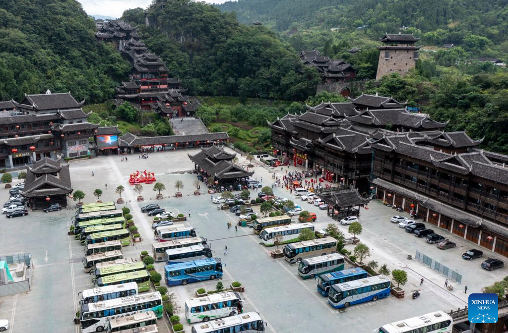 This aerial photo taken on July 20, 2024 shows tourists visiting Chiyou Jiuli Town scenic spot of Pengshui Miao-Tujia Autonomous County, southwest China's Chongqing. Local authorities of Pengshui Miao-Tujia Autonomous County has taken advantages of ethnic features to promote its summer tourism. (Xinhua/Liu Chan)