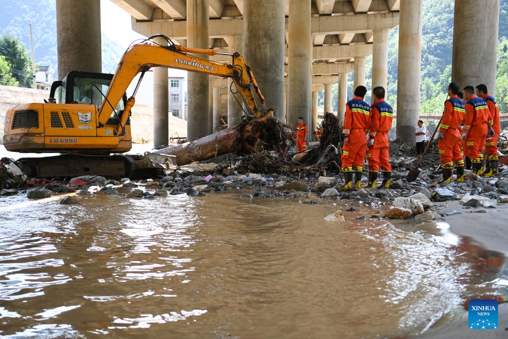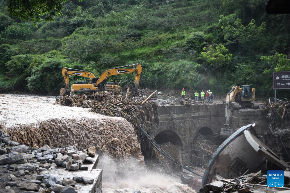 Rescuers carry out traffic restoration work at Xinhua Village, Malie Township, Hanyuan County, Ya'an City, southwest China's Sichuan Province, July 21, 2024. Rescuers have retrieved eight bodies, found and brought four to safety as of 8 p.m. Saturday, after rain-triggered flash floods in southwest China's Sichuan Province left over 30 missing.(Xinhua/Wang Xi)