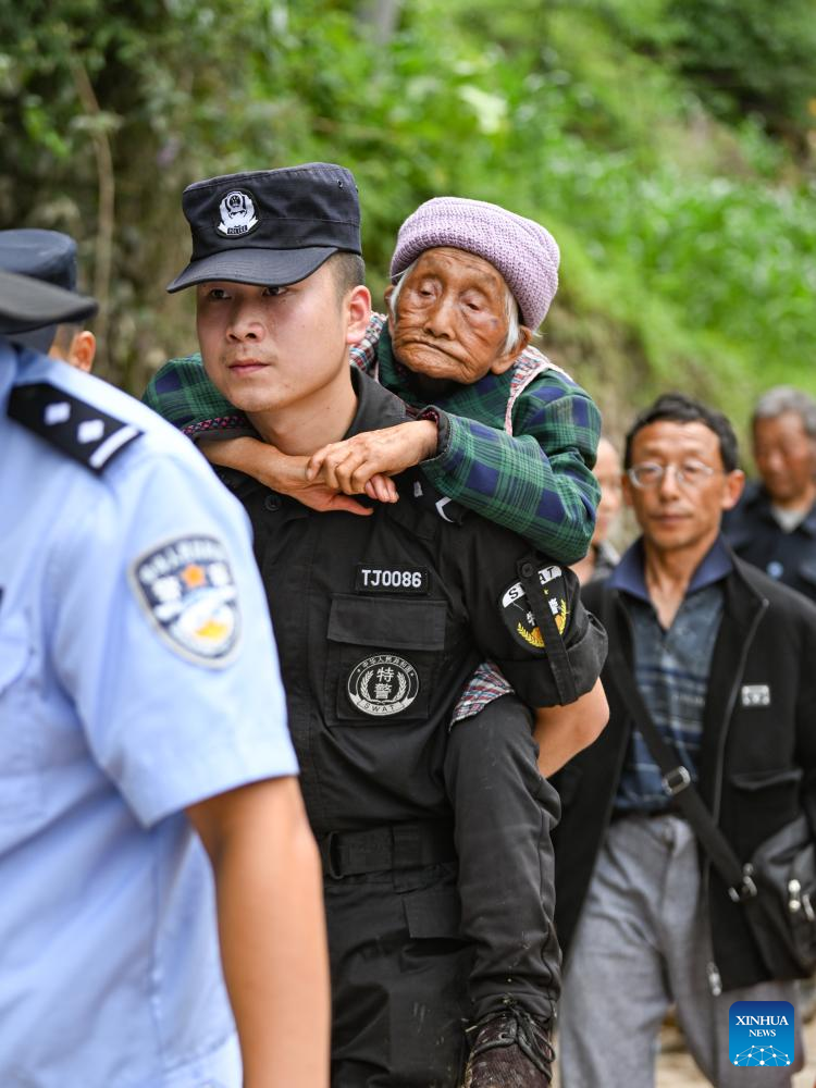 A rescuer evacuates a disaster-affected resident at Xinhua Village, Malie Township, Hanyuan County, Ya'an City, southwest China's Sichuan Province, July 21, 2024. Rescuers have retrieved eight bodies, found and brought four to safety as of 8 p.m. Saturday, after rain-triggered flash floods in southwest China's Sichuan Province left over 30 missing.(Xinhua/Wang Xi)