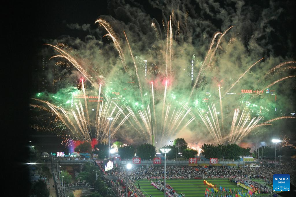 Photo taken on July 20, 2024 shows a firework show after the final match between Dangxiang Village and Dongmen Village at the Village Super League in Rongjiang County of southwest China's Guizhou Province. (Xinhua/Yang Wenbin)