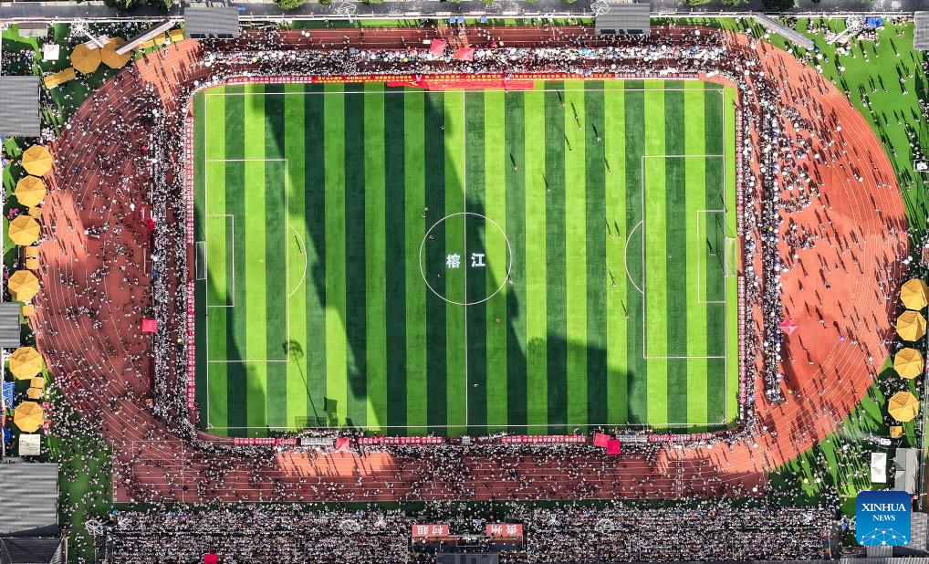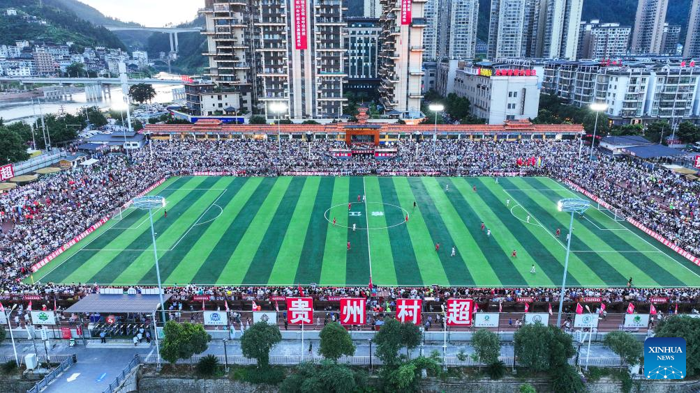 An aerial drone photo taken on July 20, 2024 shows the view of the final match between Dangxiang Village and Dongmen Village at the Village Super League in Rongjiang County of southwest China's Guizhou Province. (Xinhua/Yang Wenbin)