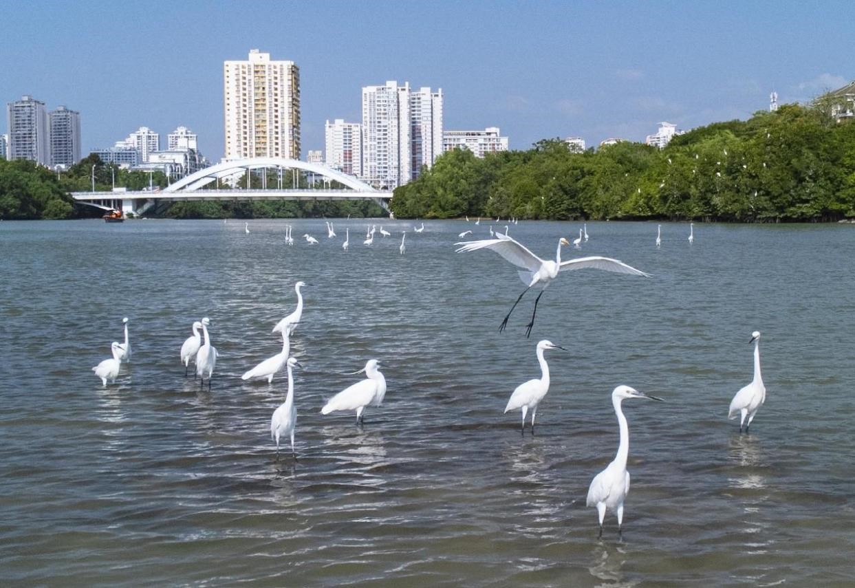Photo shows egrets on the Sanya River in Sanya, south China's Hainan province. (People's Daily Online/Ye Longbin)