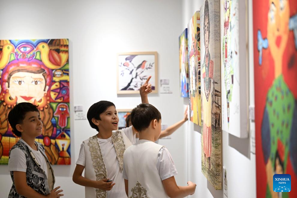 Children from a troupe of Uzbekistan visit a painting exhibition held during the 2024 Tianjin International Children's Art Festival in Tianjin, north China, July 22, 2024. The art festival, with the participation of children's art troupe from more than 20 countries and regions, will last until July 26. (Xinhua/Zhao Zishuo)