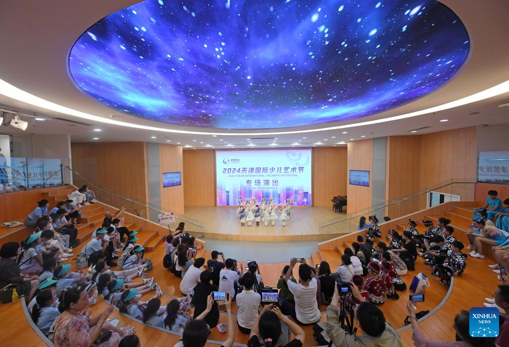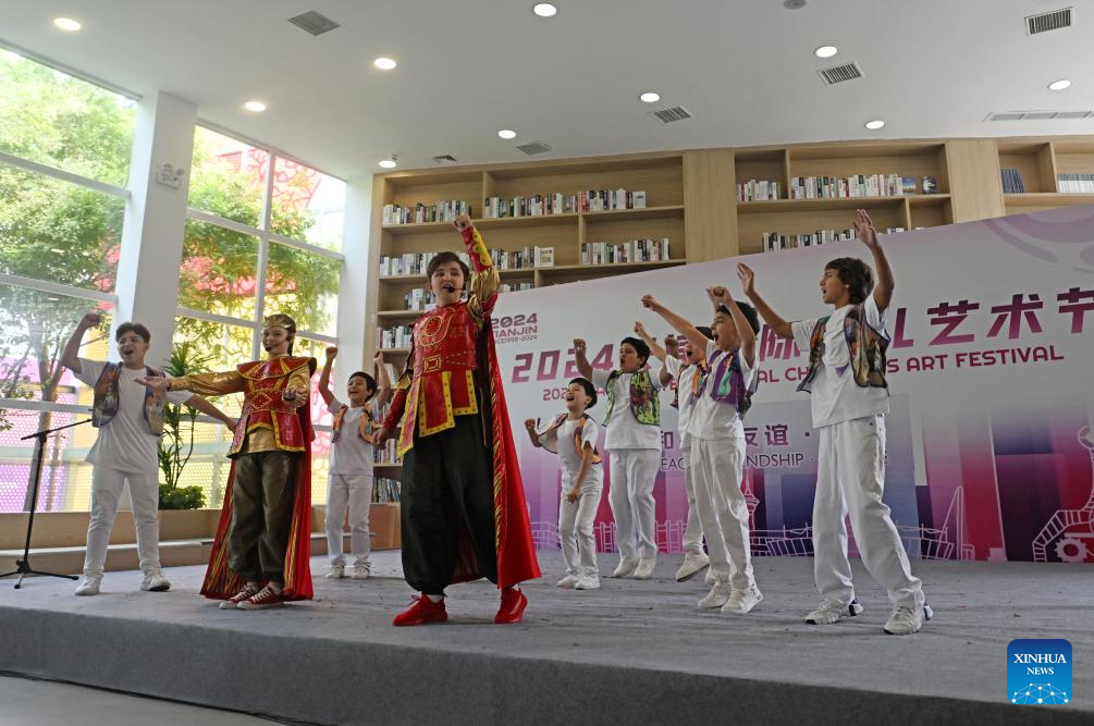 Children from an art troupe perform at the 2024 Tianjin International Children's Art Festival in Tianjin, north China, July 22, 2024. The art festival, with the participation of children's art troupe from more than 20 countries and regions, will last until July 26. (Xinhua/Zhao Zishuo)