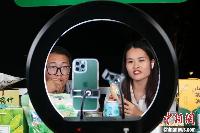 Livestreamers promote lotus products during a live-streaming session. (Photo/Xie Xin)
