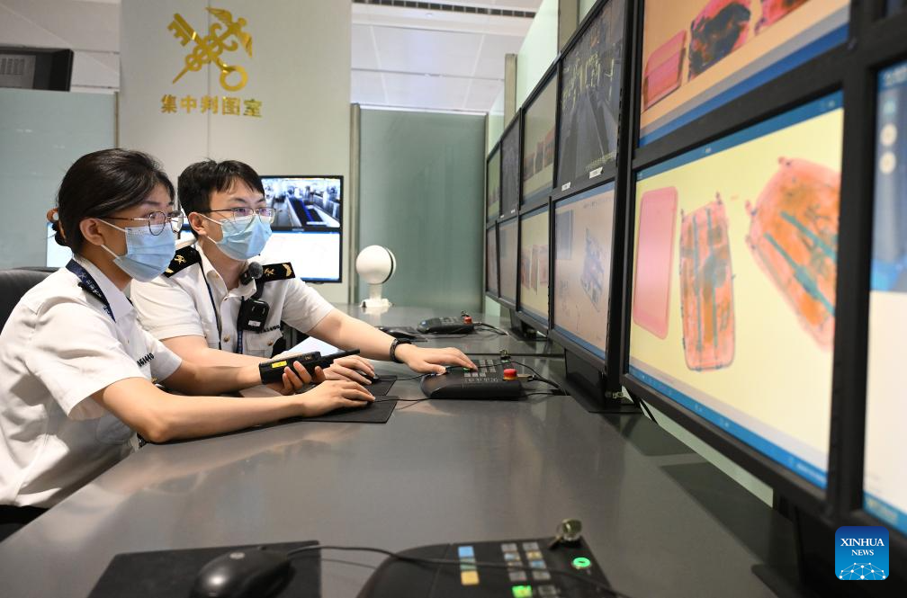 Beijing Customs staff conduct security inspection on the luggage of foreign travelers at Beijing Daxing International Airport in Beijing, capital of China, July 18, 2024. With easier entry policies, including a 144-hour visa-free transit policy that expanded to 37 entry ports as of July 15 and pilot visa-free policies for some countries, "on-a-whim travel" to China is becoming a reality. (Xinhua/Li He)