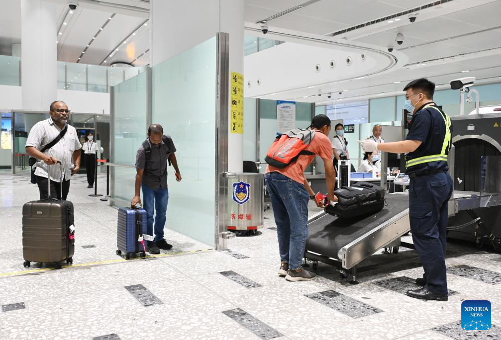 A staff member of Beijing Customs (L) conducts security inspection on the luggage of foreign travelers at Beijing Daxing International Airport in Beijing, capital of China, July 18, 2024. With easier entry policies, including a 144-hour visa-free transit policy that expanded to 37 entry ports as of July 15 and pilot visa-free policies for some countries, "on-a-whim travel" to China is becoming a reality. (Xinhua/Li He)