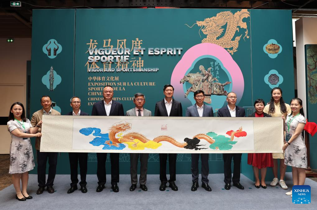 This photo taken on July 23, 2024 shows the inauguration ceremony of the Vigor and Sportsmanship Chinese Sports Culture Exhibition ahead of the Paris 2024 Olympic Games in Paris, France, July 23, 2024. (Xinhua/Zhang Fan)