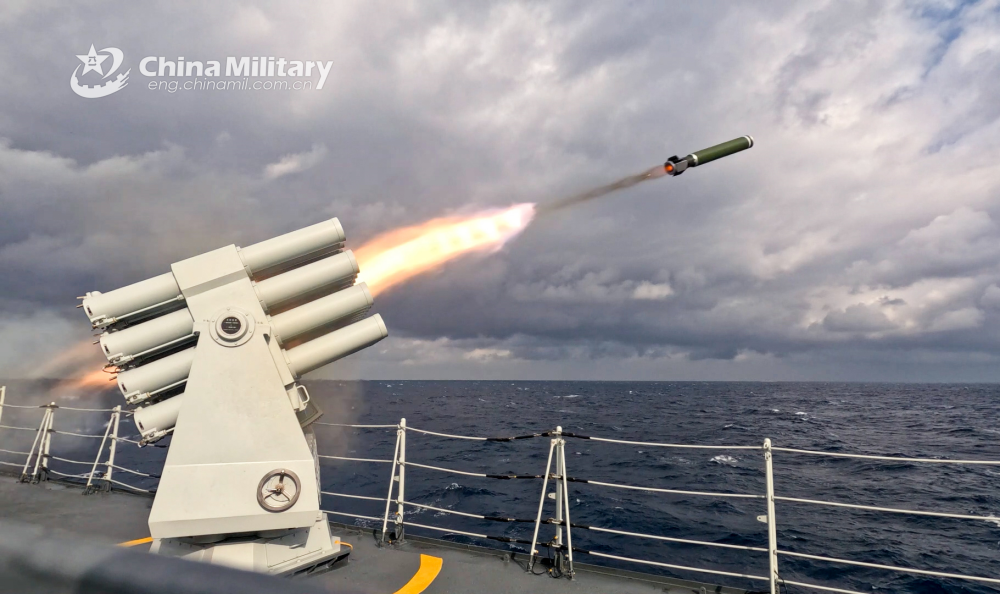 A naval vessel attached to a flotilla of the PLA Navy fires a jamming shell during a multi-subject maritime training exercise on June 11, 2024. (eng.chinamil.com.cn/Photo by Ge Hanqiang)