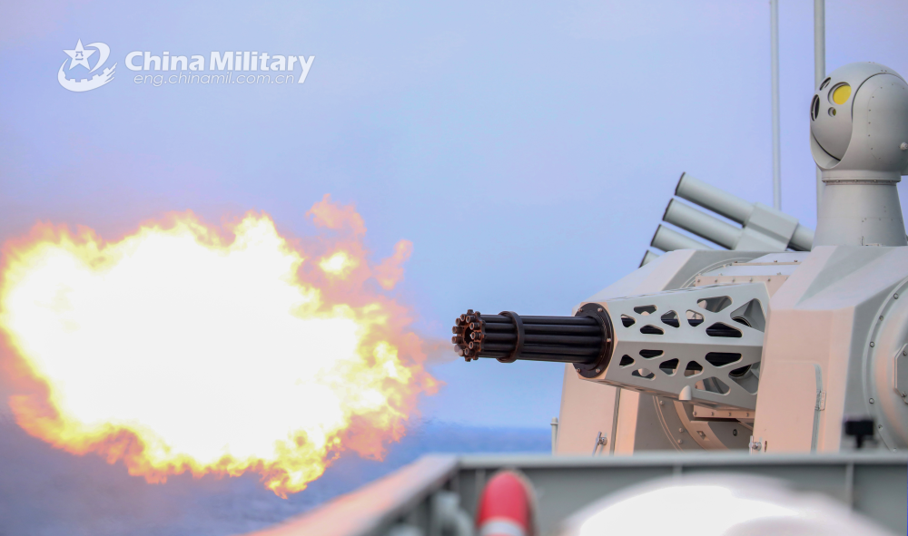 A naval vessel attached to a flotilla of the PLA Navy fires its close-in weapon system at mock targets during a multi-subject maritime training exercise on June 11, 2024. (eng.chinamil.com.cn/Photo by Zhou Muhan)