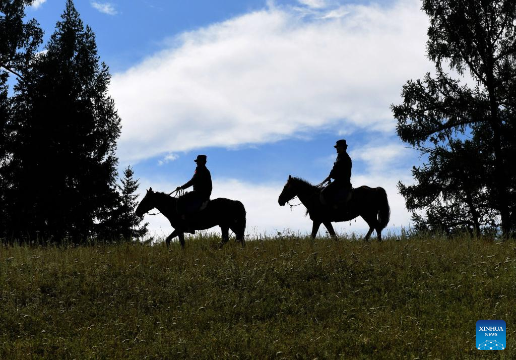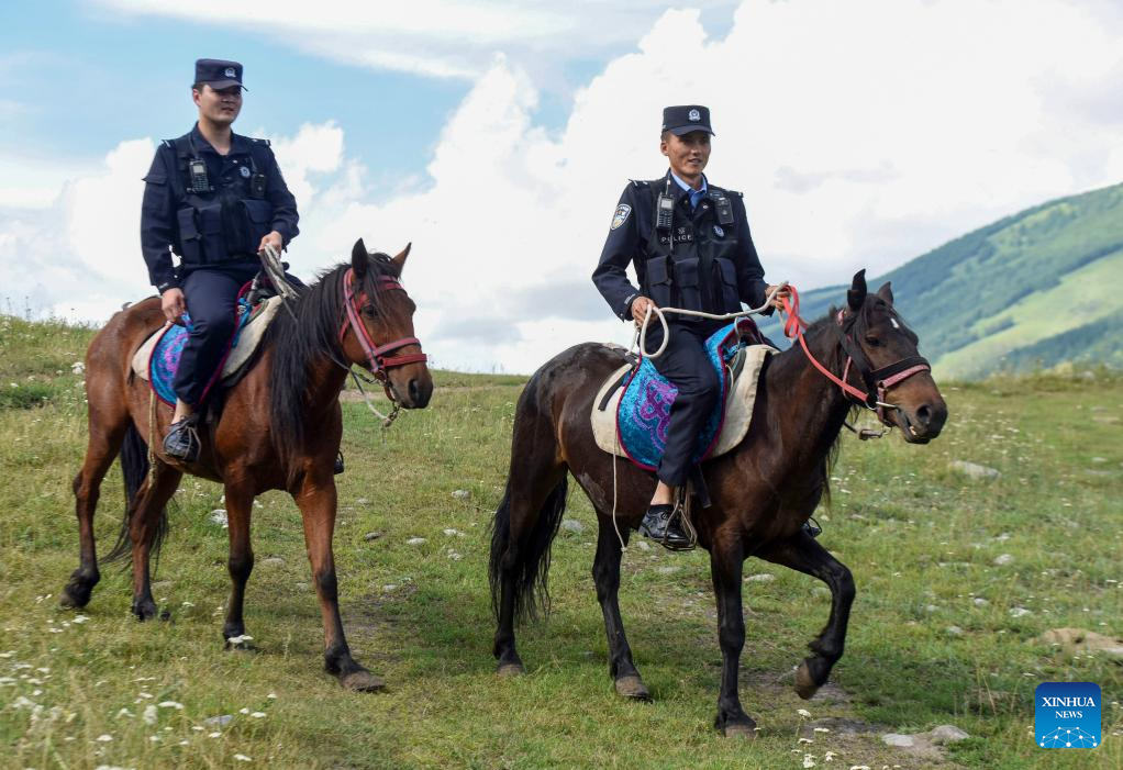 Police officers of the Kanas border police station patrol on horseback in areas inaccessible by vehicles in the Kanas scenic area of Altay, northwest China's Xinjiang Uygur Autonomous Region, July 22, 2024. (Xinhua/Huang Xiaoyong)