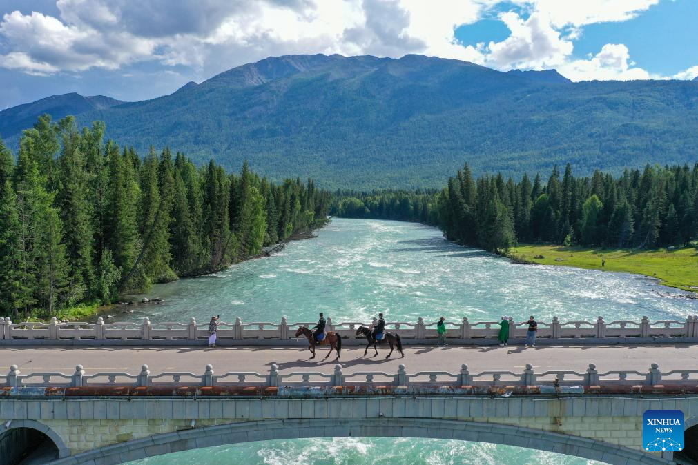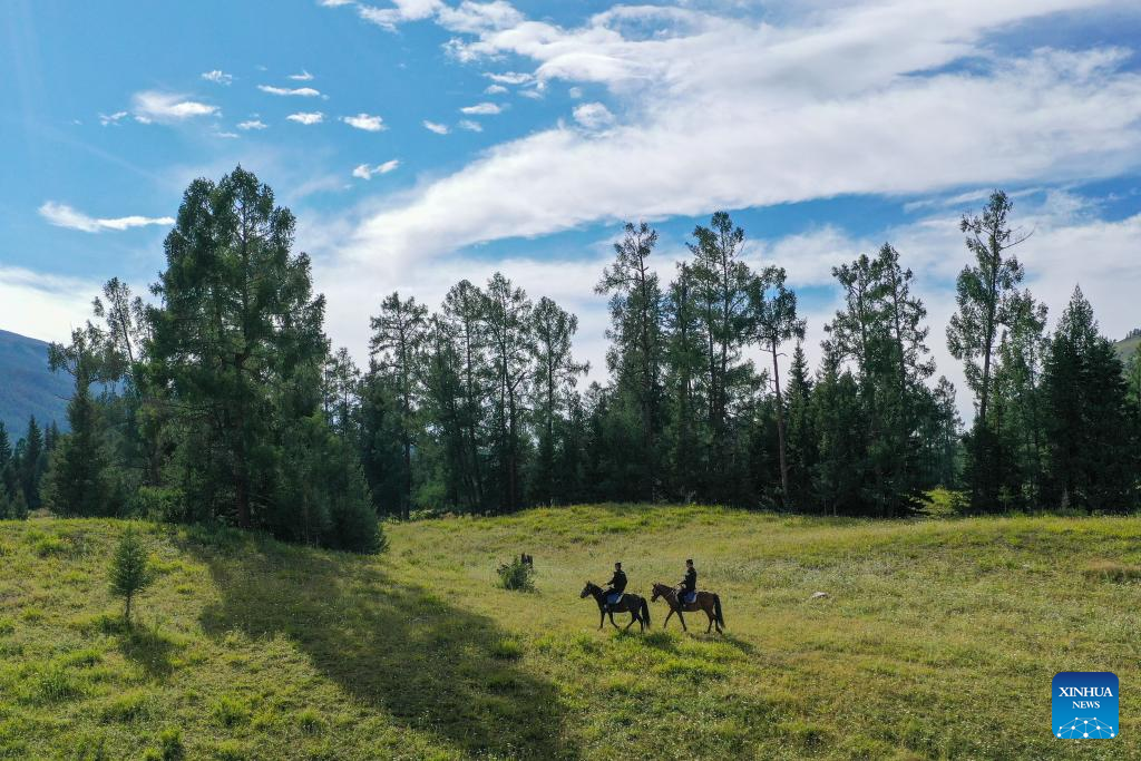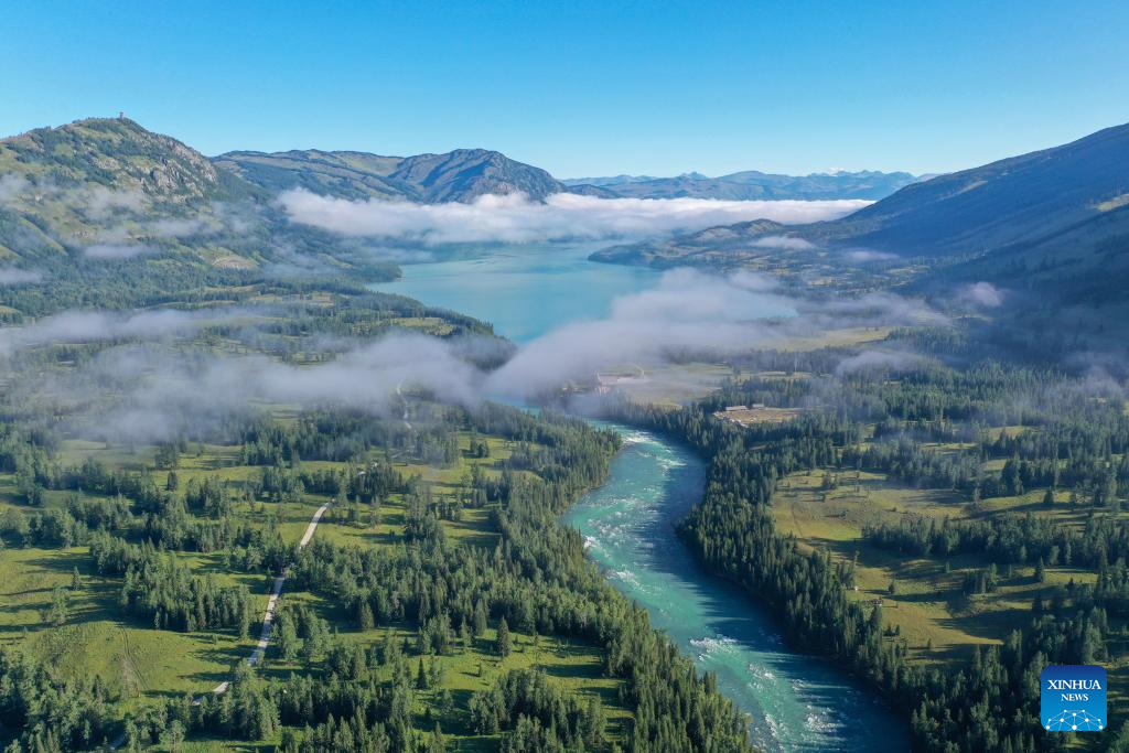 An aerial drone photo taken on July 23, 2024 shows a view of the Kanas scenic area of Altay, northwest China's Xinjiang Uygur Autonomous Region. (Xinhua/Ding Lei)