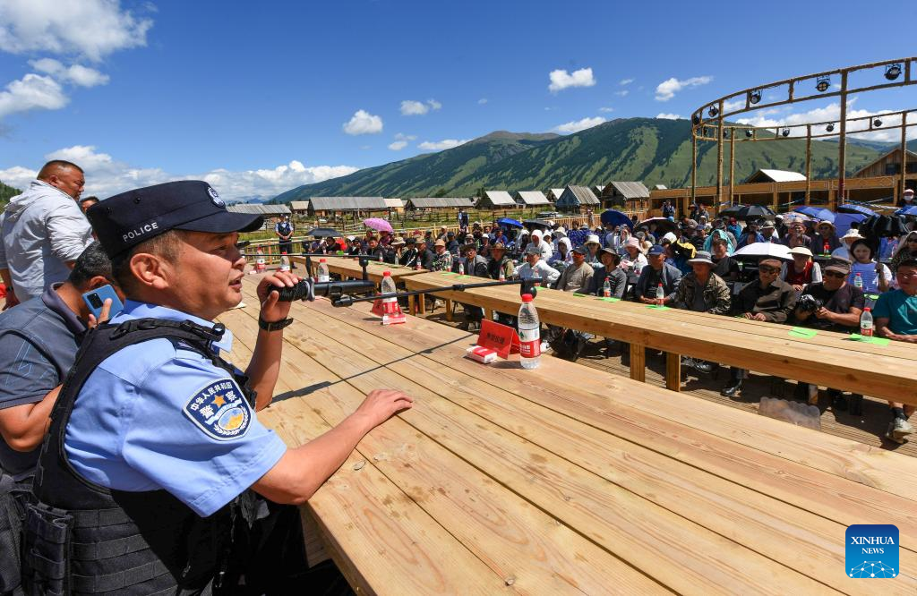 A police officer of the Kanas border police station explains border laws and regulations to villagers at a village assembly in Burqin County of Altay, northwest China's Xinjiang Uygur Autonomous Region, July 22, 2024. (Xinhua/Huang Xiaoyong)