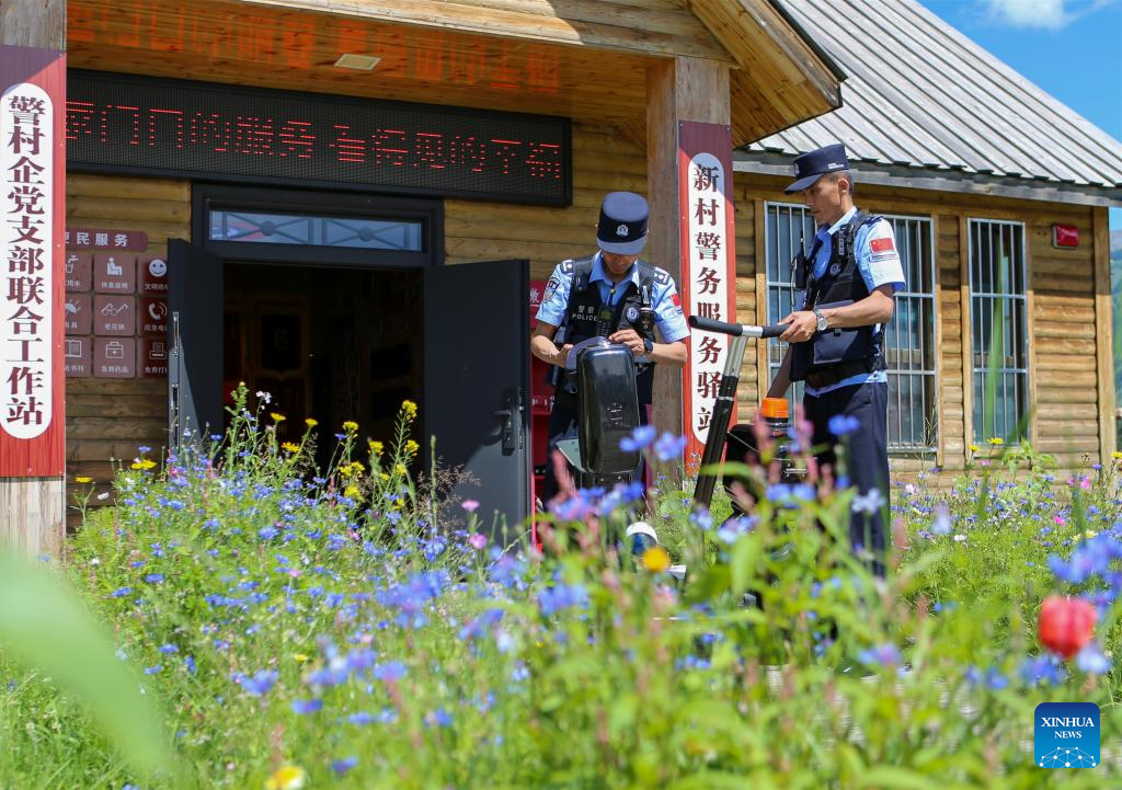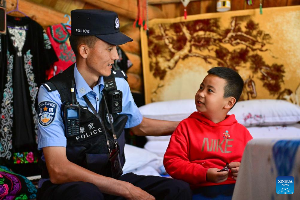 A police officer of the Kanas border police station visits a local family in Burqin County of Altay, northwest China's Xinjiang Uygur Autonomous Region, July 22, 2024. (Xinhua/Ding Lei)