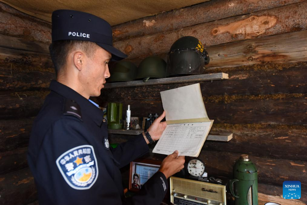 A police officer shows the roster of the first generation of border police at the original barracks of the Kanas border police station in the Kanas scenic area of Altay, northwest China's Xinjiang Uygur Autonomous Region, July 22, 2024. (Xinhua/Huang Xiaoyong)