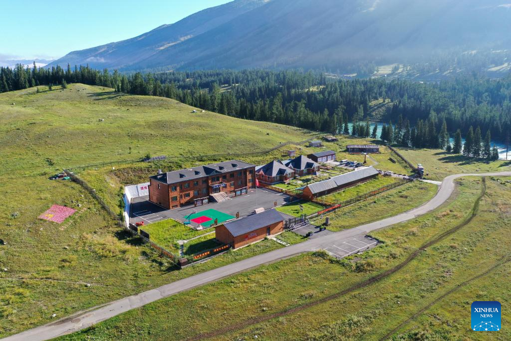 An aerial drone photo taken on July 23, 2024 shows the Kanas border police station in the Kanas scenic area of Altay, northwest China's Xinjiang Uygur Autonomous Region. (Xinhua/Ding Lei)