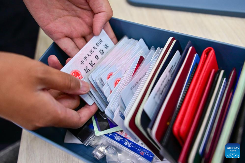 A police officer looks through lost ID cards for tourists at a service spot of the Kanas border police station in the Kanas scenic area of Altay, northwest China's Xinjiang Uygur Autonomous Region, July 22, 2024. (Xinhua/Ding Lei)