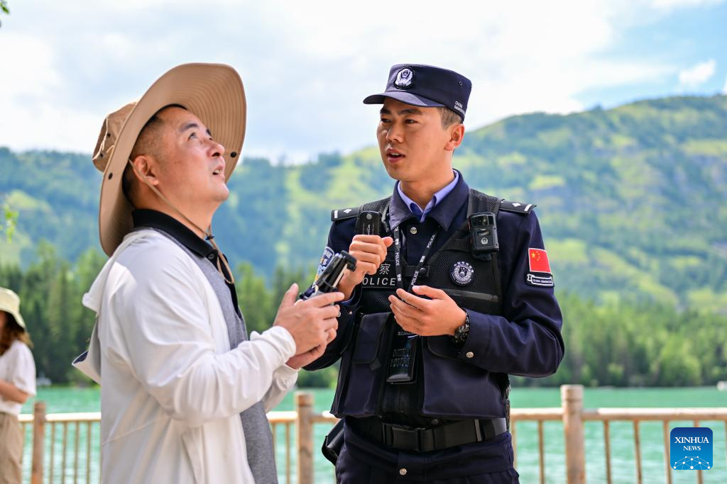 A police officer of the Kanas border police station gives directions to tourists in the Kanas scenic area of Altay, northwest China's Xinjiang Uygur Autonomous Region, July 22, 2024. (Xinhua/Lin Liping)