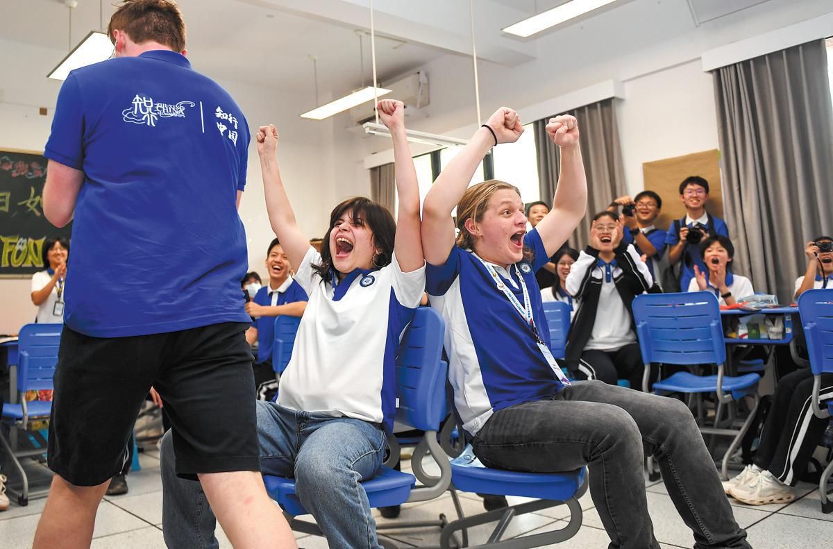 High school students from Washington State play a game with Chinese students at the Shenzhen Nanshan Foreign Language School in Guangdong province, on March 25. A series of US delegations have visited China this year. (MAO SIQIAN/XINHUA)
