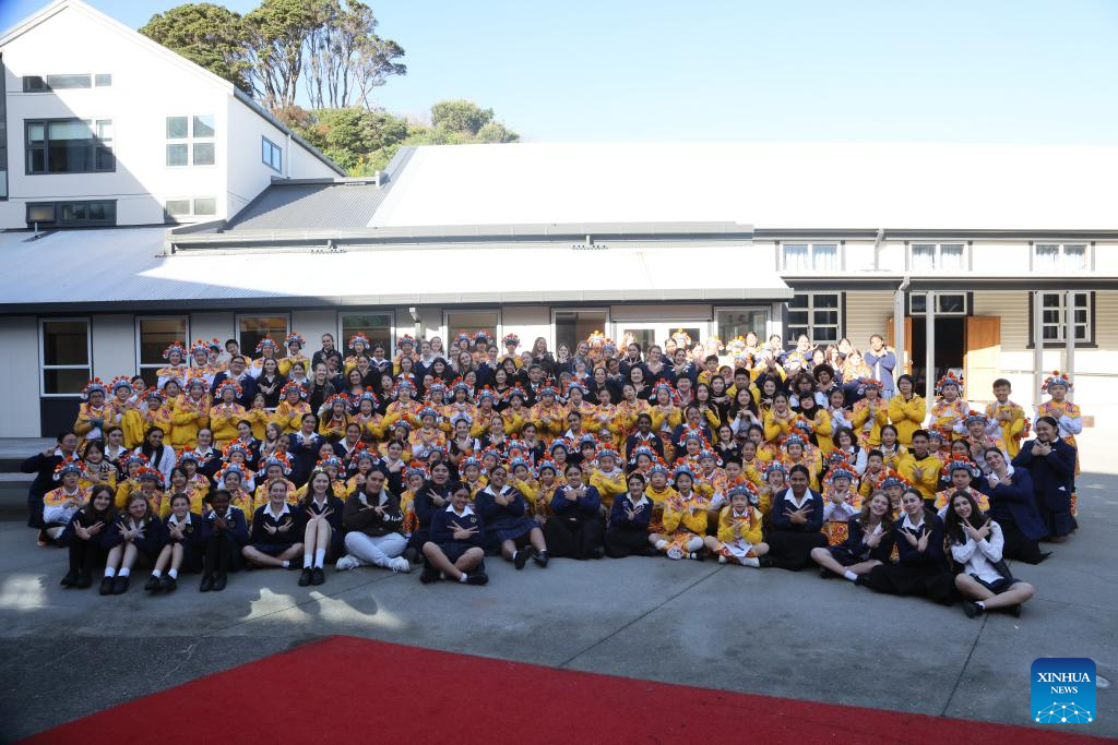 Members of China's Guangzhou Opera House Children's Choir and students of Wellington East Girls' College pose for a group photo in Wellington, New Zealand, July 24, 2024. Members of Guangzhou Opera House Children's Choir visited Wellington East Girls' College in New Zealand on Wednesday, and held a joint concert with the high school's choir at the opening ceremony of the new semester of the school. (Photo by Meng Tao/Xinhua)