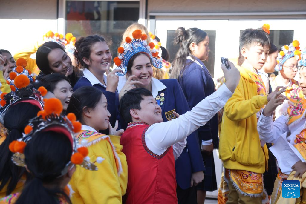 A member of China's Guangzhou Opera House Children's Choir and students of Wellington East Girls' College take selfies in Wellington, New Zealand, July 24, 2024. Members of Guangzhou Opera House Children's Choir visited Wellington East Girls' College in New Zealand on Wednesday, and held a joint concert with the high school's choir at the opening ceremony of the new semester of the school. (Photo by Meng Tao/Xinhua)