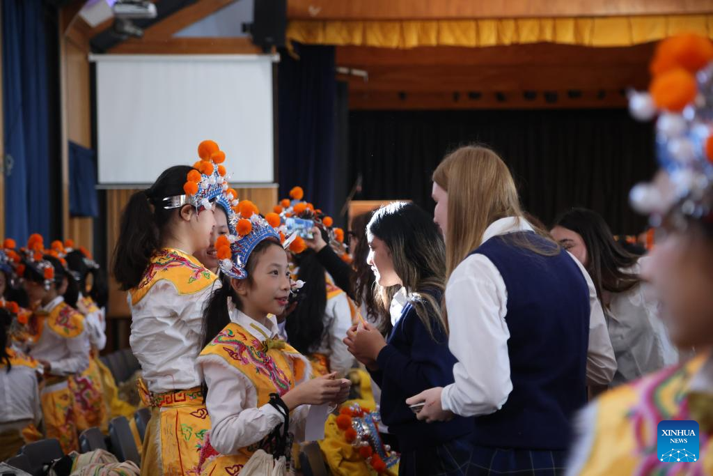 Members of China's Guangzhou Opera House Children's Choir talk with students of Wellington East Girls' College in Wellington, New Zealand, July 24, 2024. Members of Guangzhou Opera House Children's Choir visited Wellington East Girls' College in New Zealand on Wednesday, and held a joint concert with the high school's choir at the opening ceremony of the new semester of the school. (Photo by Meng Tao/Xinhua)