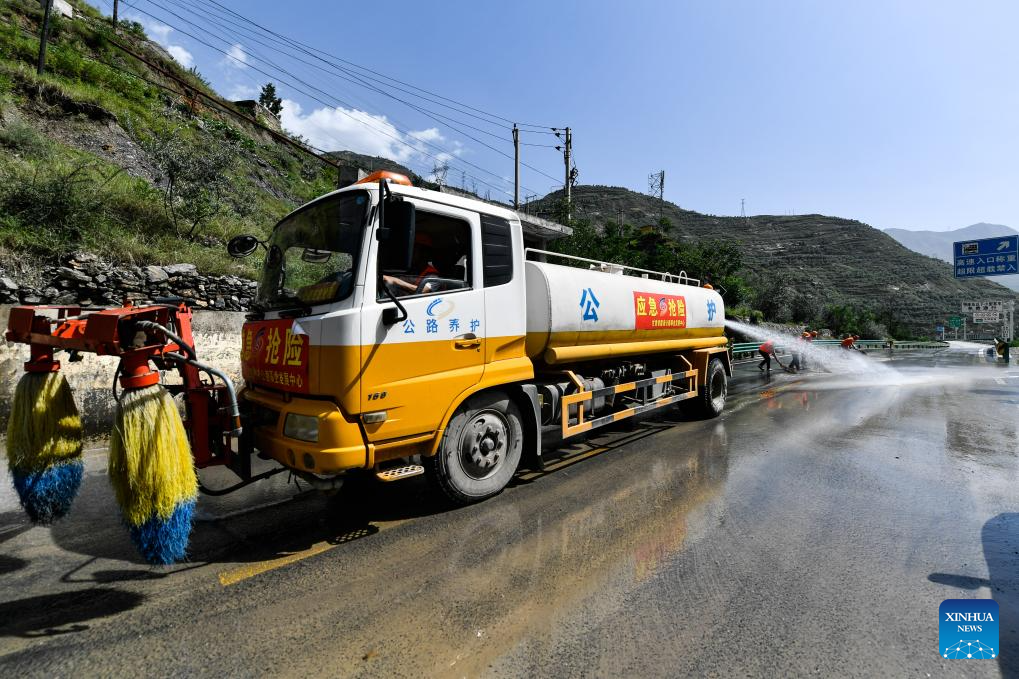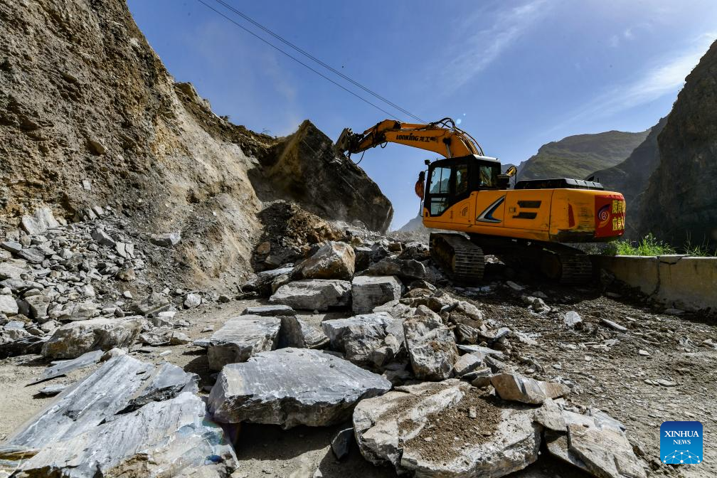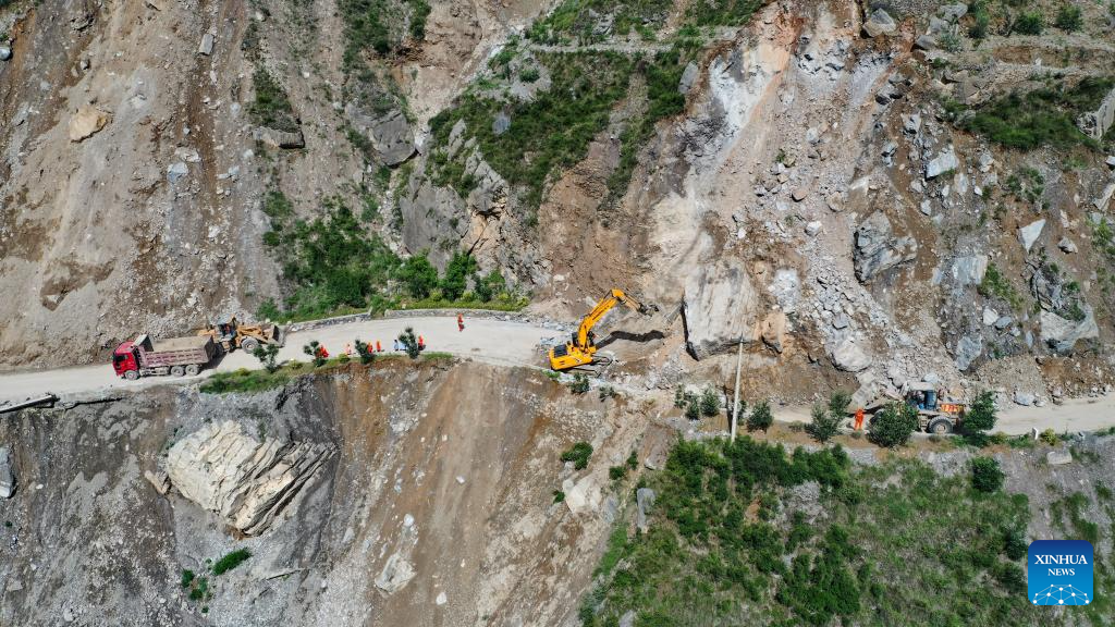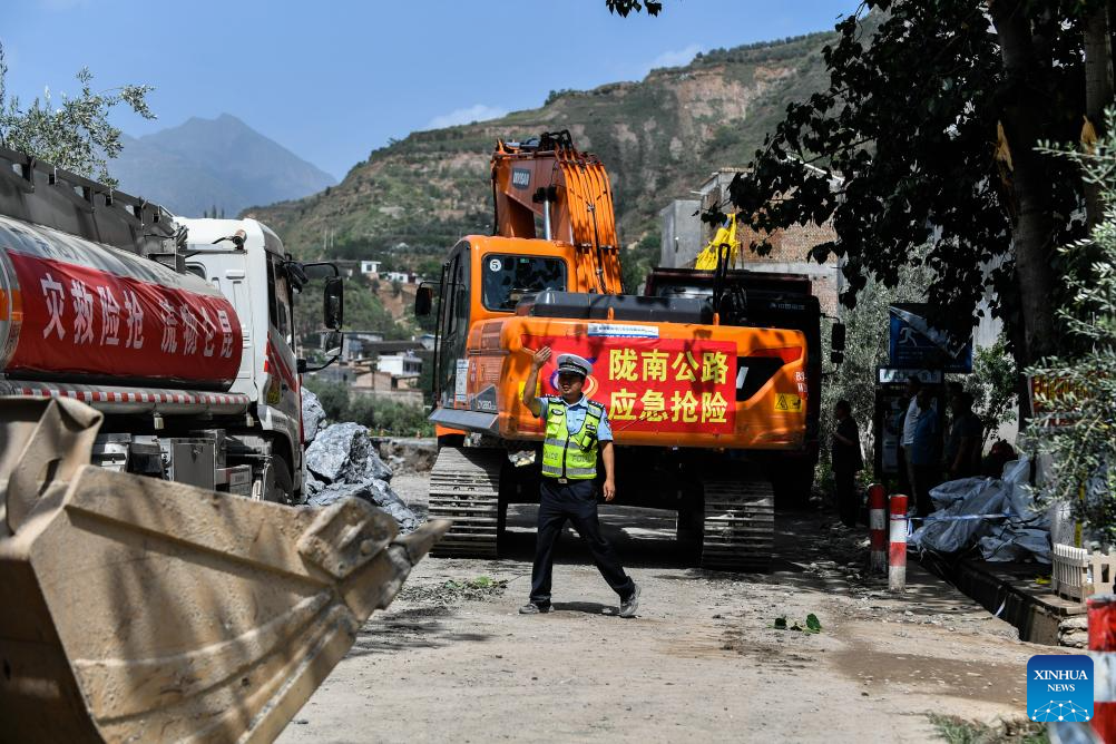 A landslide-blocked section is being cleared along the national highway No. 212 at Waina Township of Wudu District in Longnan City, northwest China's Gansu Province, July 25, 2024. (Xinhua/Lang Bingbing)