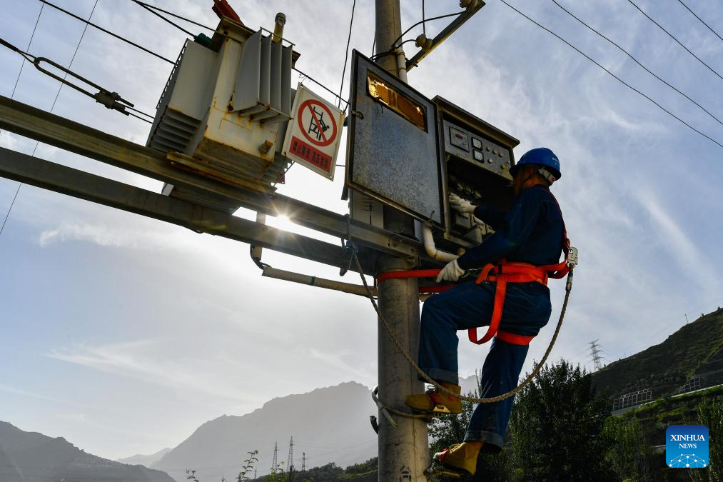 A technician repairs power facilities at Zhulin Village of Wudu District in Longnan City, northwest China's Gansu Province, July 25, 2024.?(Xinhua/Lang Bingbing)