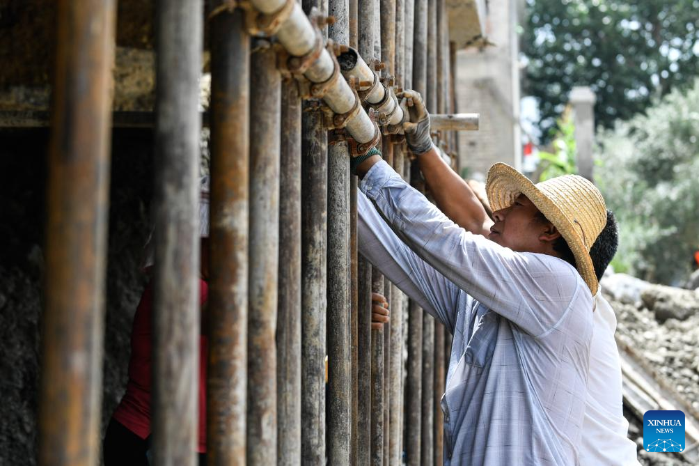 Villagers fortify the foundation of a house at Zhulin Village of Wudu District in Longnan City, northwest China's Gansu Province, July 25, 2024.?(Xinhua/Lang Bingbing)