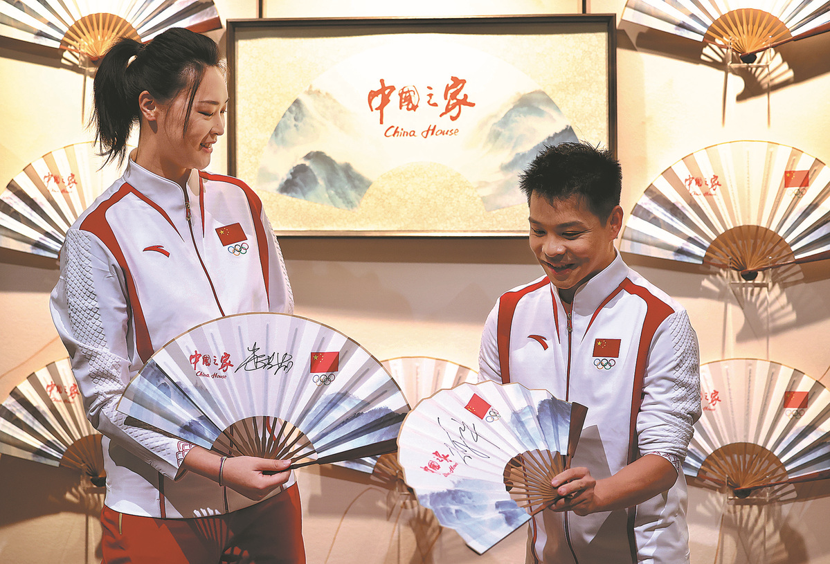 Former volleyball player Hui Ruoqi (left) and former diver He Chong display folding fans with their signatures at the China House in the Hotel Salomon de Rothschild in Paris, France, on Wednesday. The China House, a pavilion set up and operated by the Chinese Olympic Committee, opened to the public on Wednesday, two days before the opening of the Paris Olympic Games. (WEI XIAOHAO/CHINA DAILY)