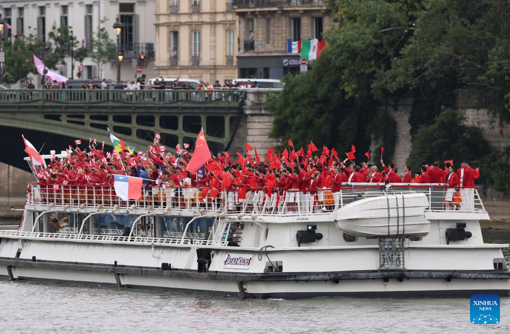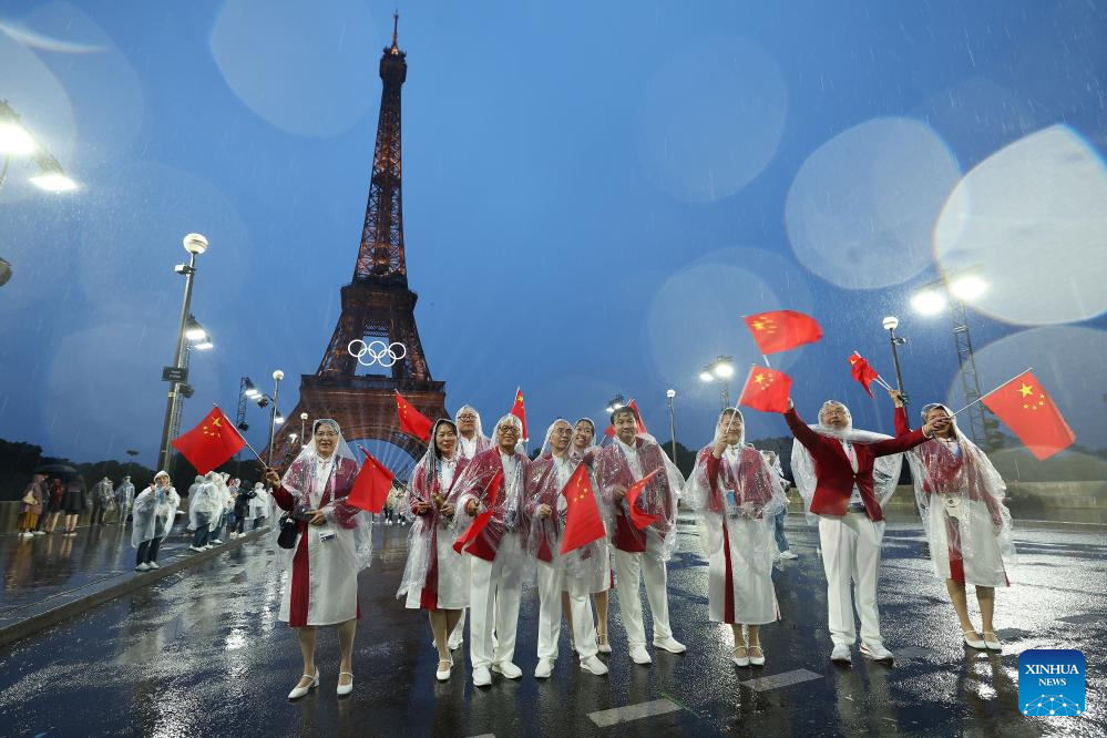 Members of the Chinese delegation attend the opening ceremony of the Paris 2024 Olympic Games in Paris, France, July 26, 2024. (Xinhua/Gao Jing)