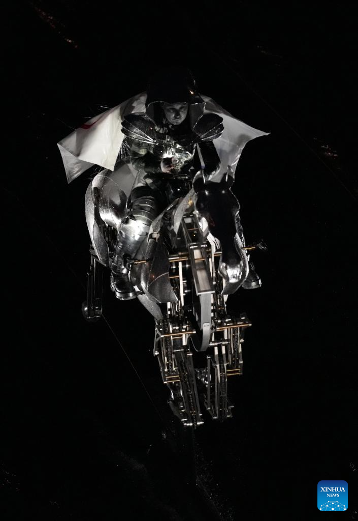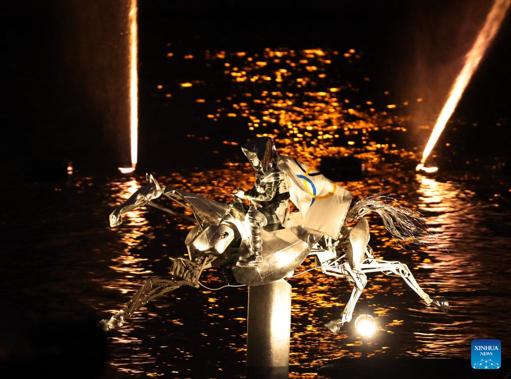 Floriane Issert, a Gendarmerie non-commissioned officer of the National Gendarmerie, rides on a mechanical metal horse up the Seine river, wrapped in the Olympic flag during the opening ceremony of the Paris 2024 Olympic Games in Paris, France, July 26, 2024. (Xinhua/Wan Xiang)