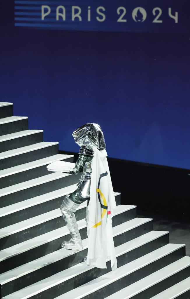 Floriane Issert, a non-commissioned officer of the French national gendarmerie, carries the Olympic flag to the Trocadero Stadium during the opening ceremony of the Paris 2024 Olympic Games in Paris, France, July 26, 2024. (Xinhua/Li Ying)