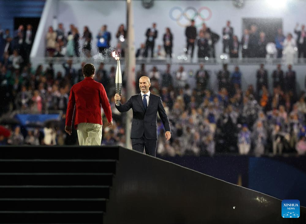 Former French football player Zinedine Zidane carries the Olympic flame at the Trocadero Stadium during the opening ceremony of the Paris 2024 Olympic Games in Paris, France, July 26, 2024. (Xinhua/Li Ying)