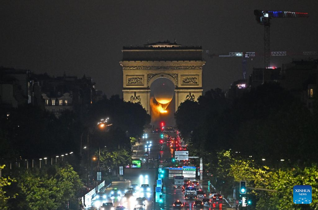A balloon carrying the lit Olympic cauldron lifts off near Arc de Triomphe during the opening ceremony of the Paris 2024 Olympic Games in Paris, France, July 26, 2024. (Xinhua/Wu Lu)
