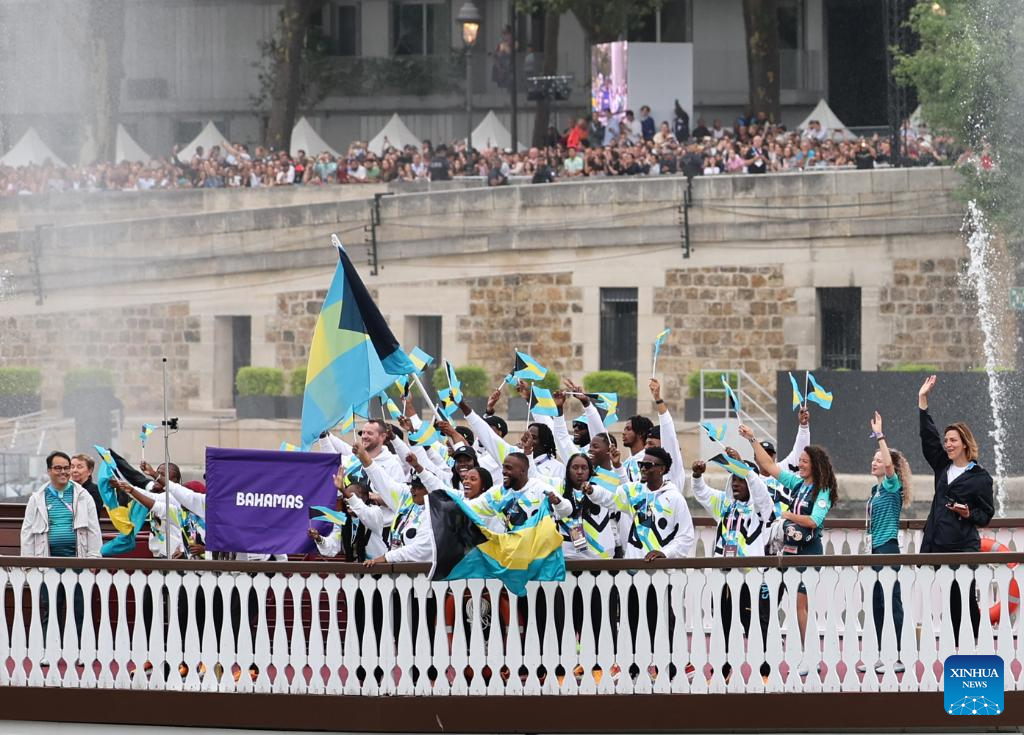 Members of the delegation of Bahamas are seen during the opening ceremony of the Paris 2024 Olympic Games in Paris, France, July 26, 2024. (Xinhua/Guo Yu)