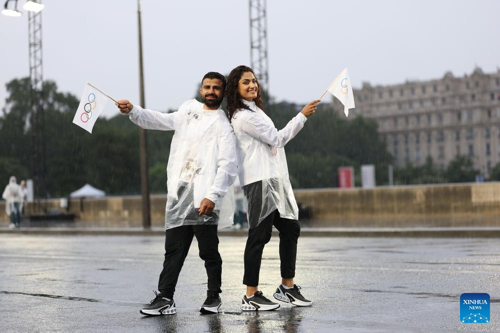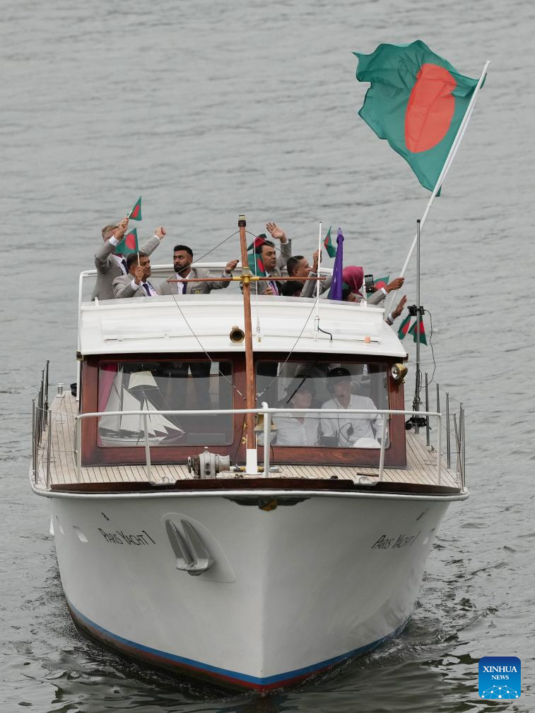 Members of the delegation of Bangladesh are seen during the opening ceremony of the Paris 2024 Olympic Games in Paris, France, July 26, 2024. (Xinhua/Wan Xiang)