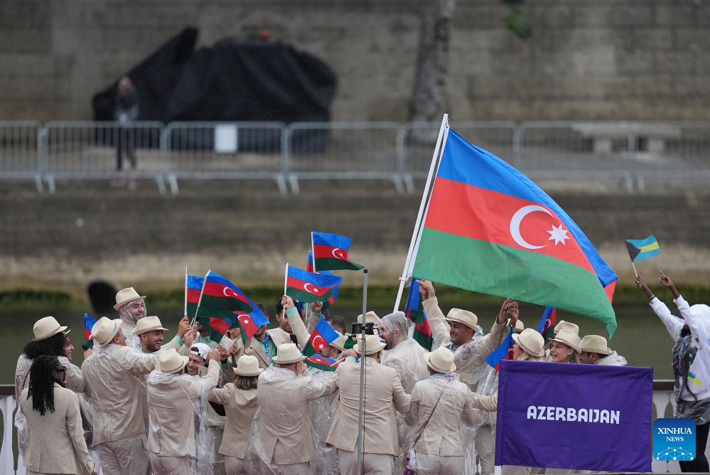 Members of the delegation of Azerbaijan are seen during the opening ceremony of the Paris 2024 Olympic Games in Paris, France, July 26, 2024. (Xinhua/Meng Yongmin)