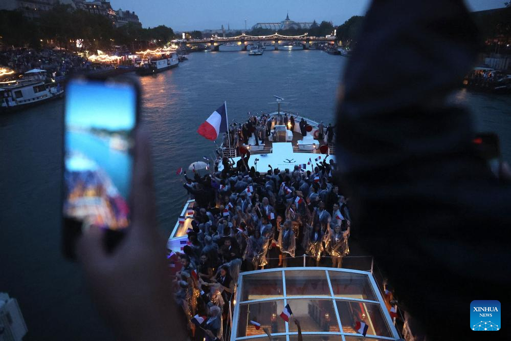 Members of the French delegation are seen during the opening ceremony of the Paris 2024 Olympic Games in Paris, France, July 26, 2024. (Xinhua/Fei Maohua)