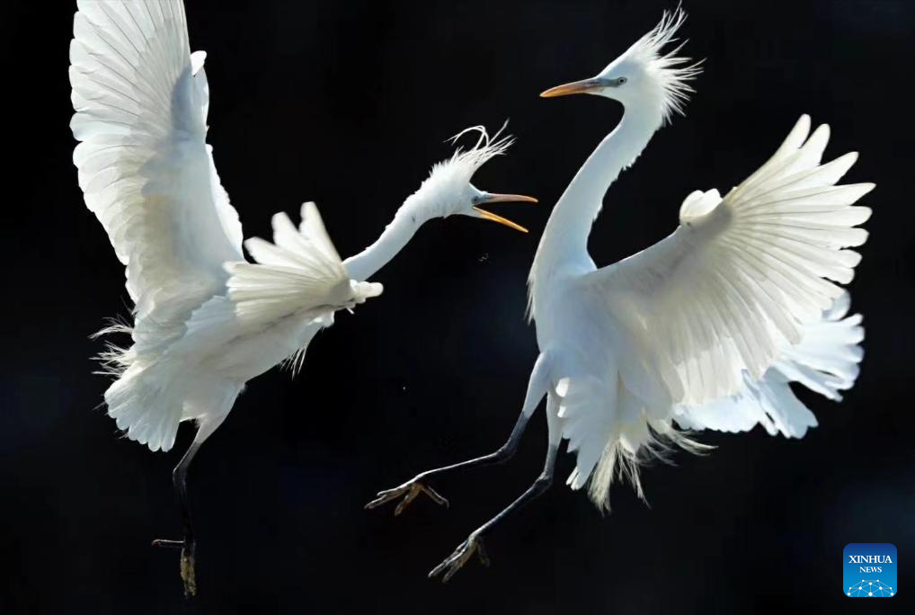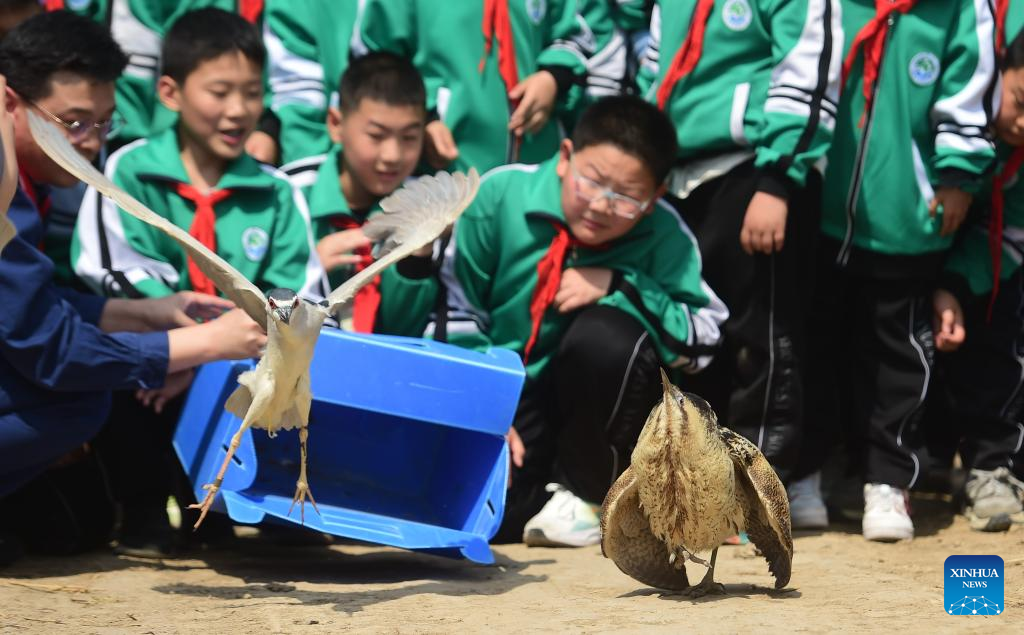 A night heron and a great bittern are released into the wild at Nandagang wetland in Cangzhou, north China's Hebei Province, April 7, 2024. Five nominated sites of the migratory bird sanctuaries along the coast of Yellow Sea-Bohai Gulf of China successfully passed the review process Friday to be included on the World Heritage List by the United Nations Educational, Scientific and Cultural Organization (UNESCO).